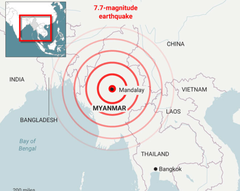 2025년 3월 28일, 미얀마 중부에서 규모 7.7의 강진이 발생하여 미얀마와 인근 지역에 심각한 피해를 초래했습니다. 진앙은 미얀마 제2의 도시인 만달레이에서 서쪽으로 약 17.2km 떨어진 사가잉 지역으로, 지진의 깊이는 10km로 측정되었습니다.